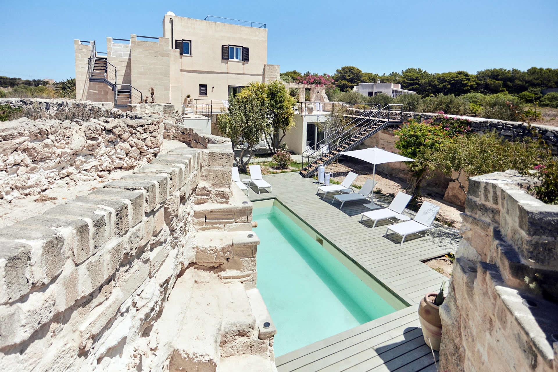 Ogni camera o appartamento dispone di incantevoli terrazze arredate con sedie a sdraio, tavolo da pranzo e salottino relax.